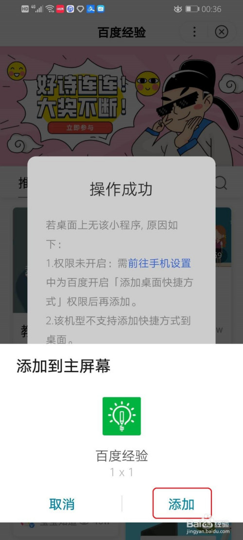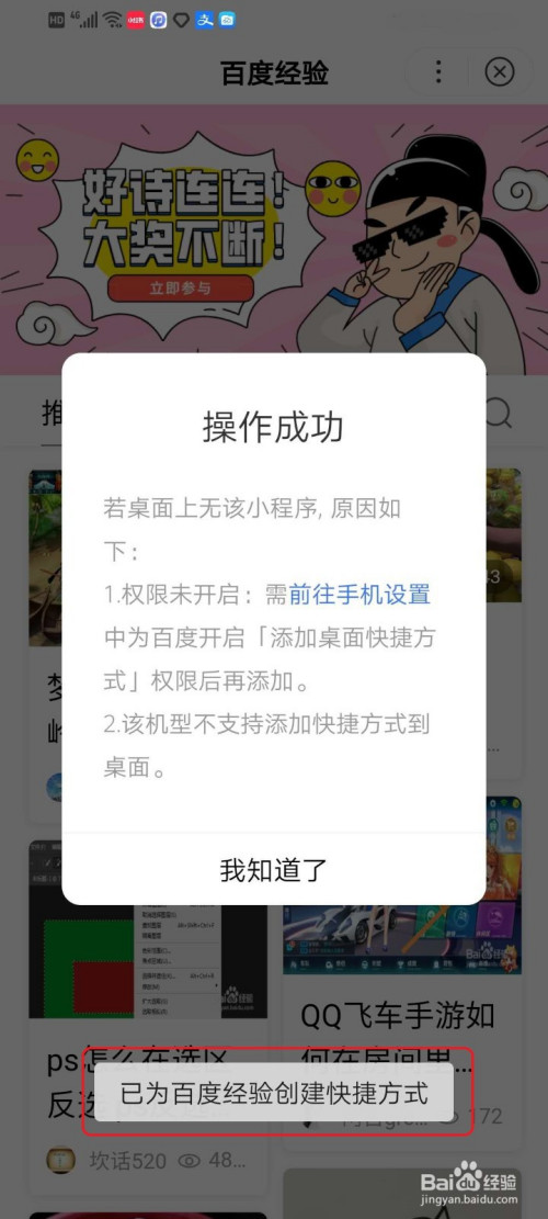 添加当作功之后,屏幕底部会呈现提醒“已为百度经验建立快捷体例”。