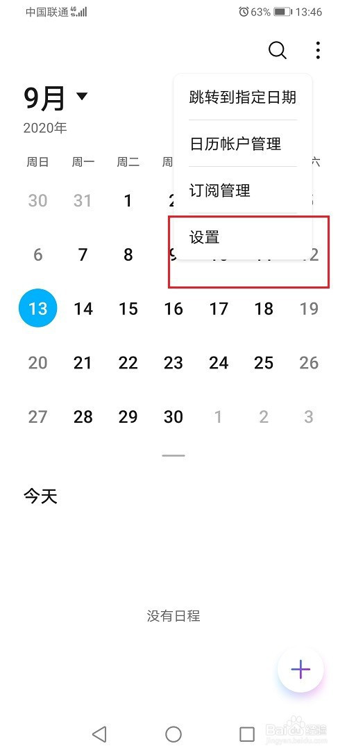 第二步进去华为手机日历之后,点击三点图标,然后点击设置