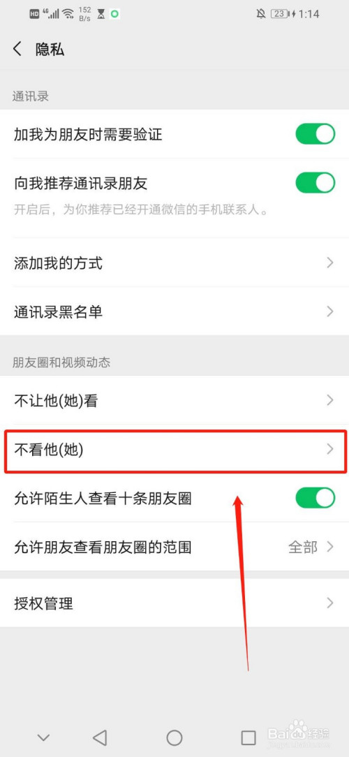 进入“隐私”界面后,点击“隐私”界面第六行的“不看他(她)”,