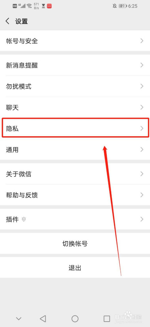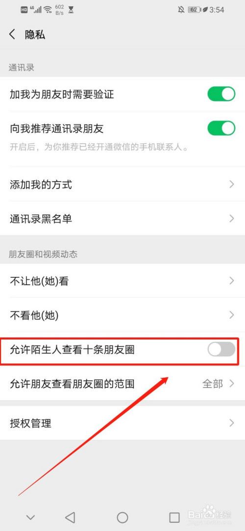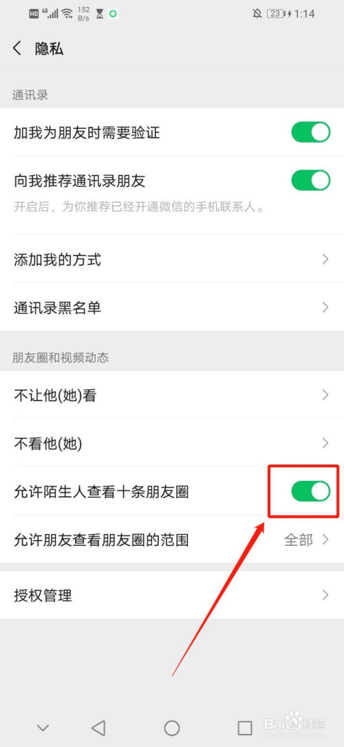 进入“隐私”界面后,点击“隐私”界面第七行的“许可目生人查看十条朋友圈”旁边绿色区域白色圆圈
