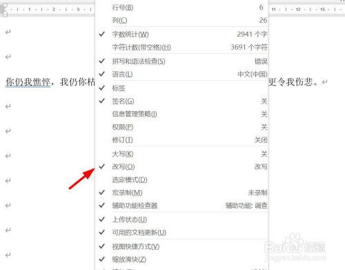 在word文档下方状况栏空白处,单击右键,在“改写”前面打勾。