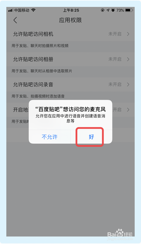 7.在接下来的界面,点击【好】选项,完当作以上步调百度贴吧app即可许可贴吧拜候灌音功能。