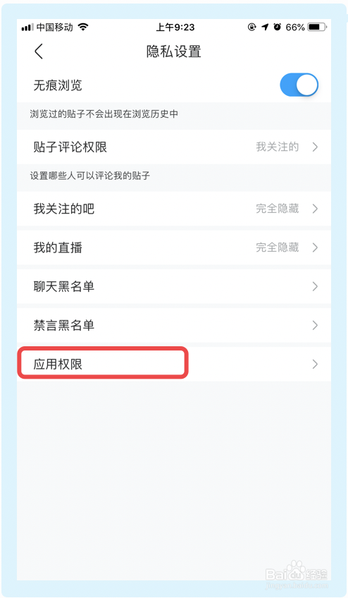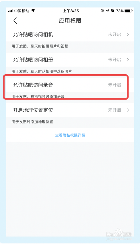 6.在【应用权限】界面,点击【许可贴吧拜候灌音】;