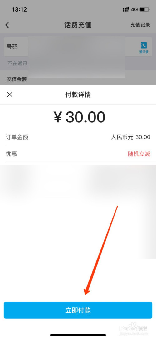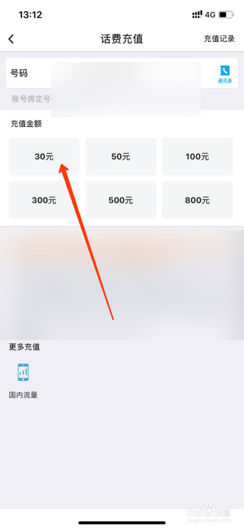 上方输入德律风号码,选择大于等于30的金额