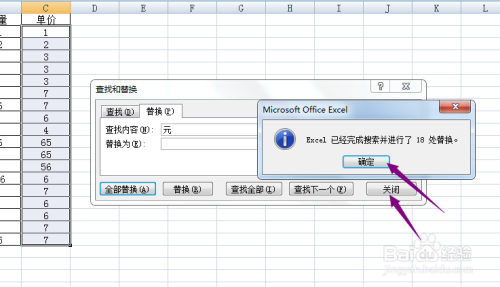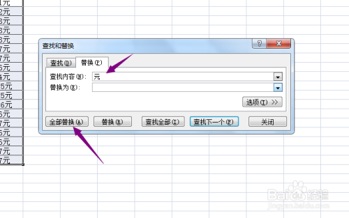 然后在查找内容中输入元,在替代为中输入空格键,点击全数替代。