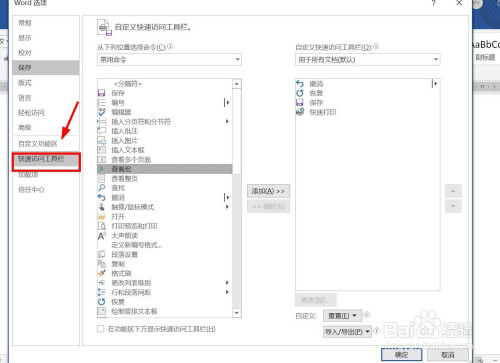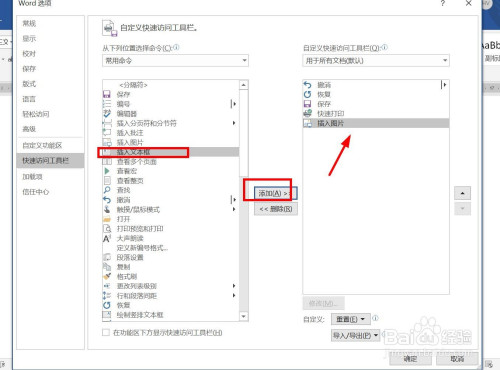 在左边号令框内点击某个功能,然后点击“添加”。可以将某个功能号令添加到“快速拜候东西栏”。点击确定即可。