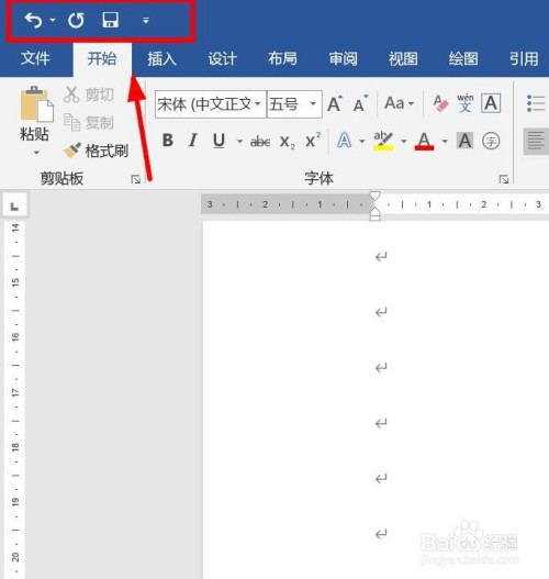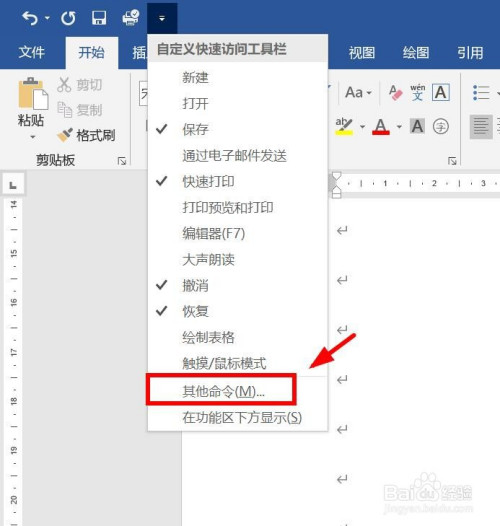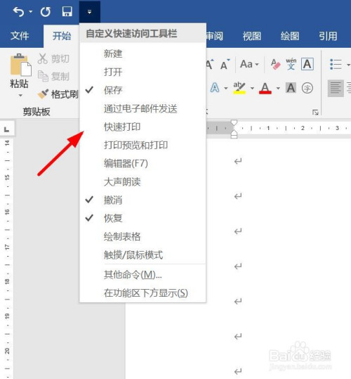 打开word文档。可以看到“快速拜候东西栏”显示3个功能。点击右边的标的目的下小箭头。