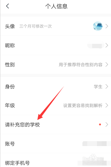 在小我信息里,点击弥补您的黉舍。