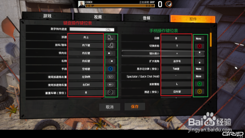 这里可以看到游戏键位对应的功能,左侧红色框代表【键盘键位】,右侧绿色框代表【手柄键位】。