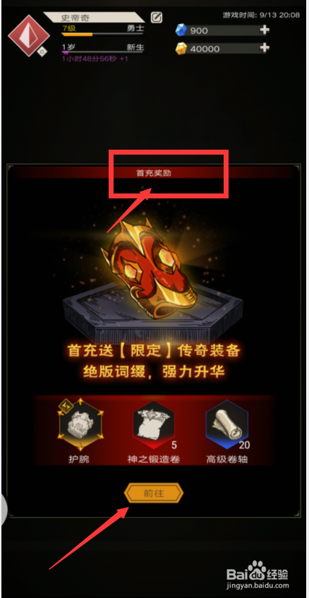 点击首充完当作充值使命获得装备。