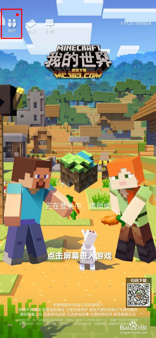 我们进入到我的世界登录界面,然后点击左上角用户。