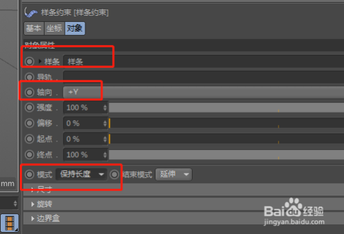 在样公约束属性面板“对象”通道中,将对象面板中的“样条对象”拖到属性“样条”选项中,将轴标的目的点窜为Y轴。可是我们会发现此时的样条线被拉伸了。将“模式”点窜为“连结长度”既可。