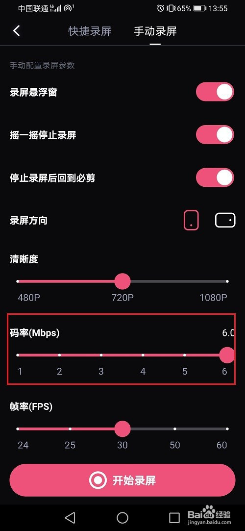 第四步进去手动录屏之后,可以设置录屏码率,默认是6
