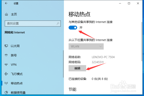 成果如图所示,这样便开启了移动热点。别的,可以点击下方的编纂来更改收集名称和密码。