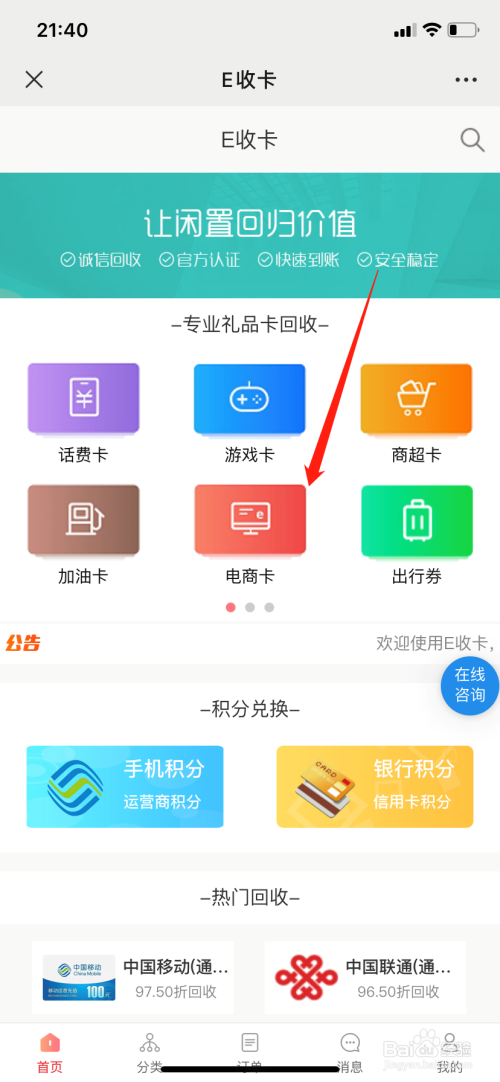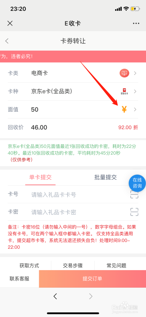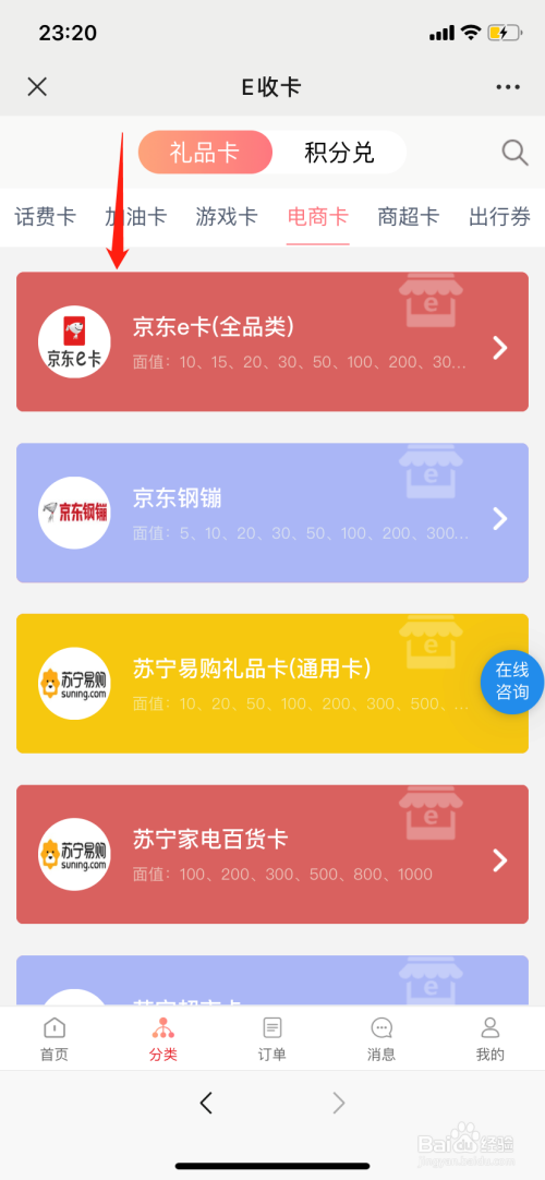 在商超卡菜单中选择京东E卡,然后选择对应的面值,按提醒输入对应的信息选择提交即可。