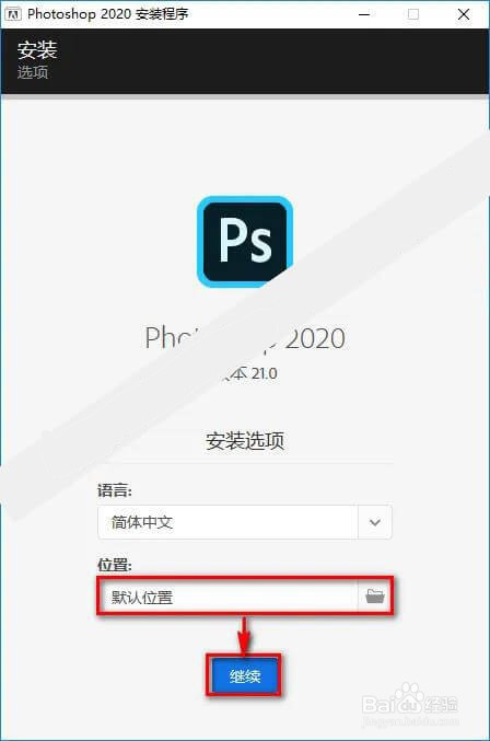 路径说话都选择好后,就可以安装了,因为photoshop2020版本软件较大,所以软件安装需要一点时候,在软件安装的过程中,我们耐烦期待