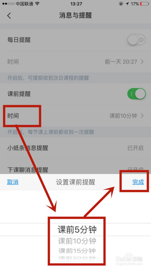 课前提醒按钮打开后,点击时候,并在弹出的小框中选择本身要设置的时候段后点击完当作。