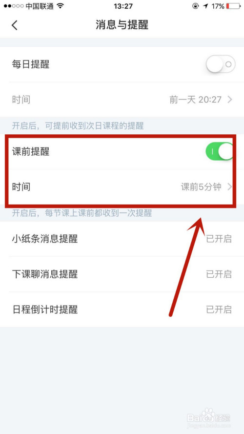 4.紧接着,页面会显示出本身设置的课前提醒时候。