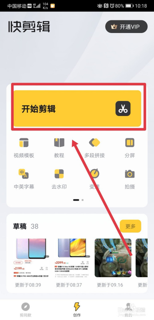 进入快剪辑后,在首页点击起头剪辑,进入视频剪辑页面;