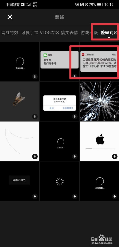 进入到装饰页面后,我们可以看到有良多素材供我们选择,我们点击进入整蛊专区,然后找到银行转账的内容,点击他,即可完当作添加;