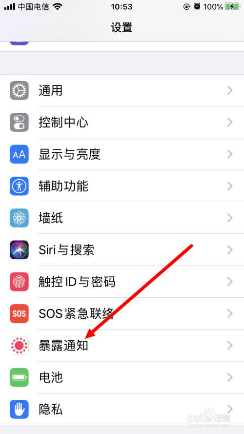 1、打开苹果手机的【设置】界面,在首界面中点击【表露通知】;