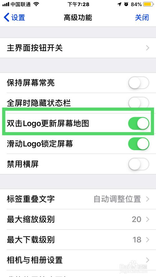 5.最后,在高级功能界面点击开启双击logo更新屏幕地图按钮