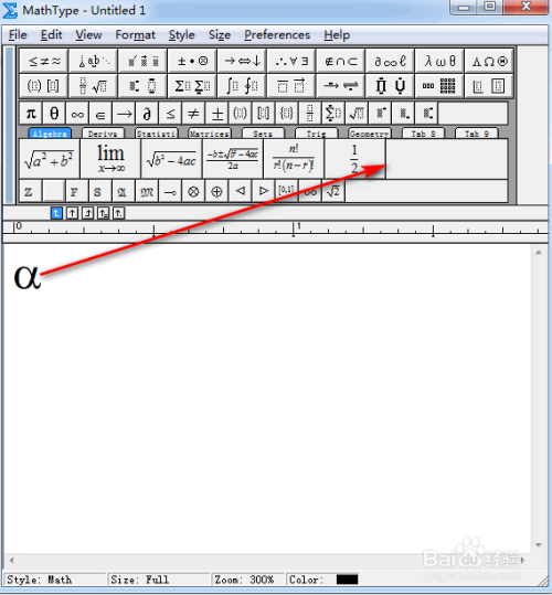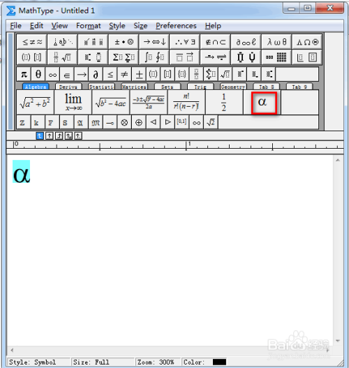 可以看到α符号已经输入完当作,选中该符号,并拖到到某个常用公式区域,具体如图所示:
