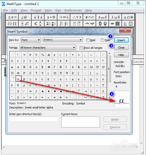 在符号面板中,找到并点中α符号,然后依次点击“插入”与“封闭”,具体如图所示: