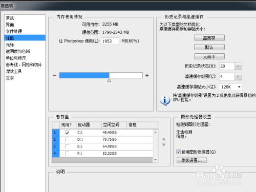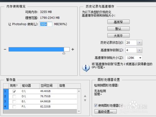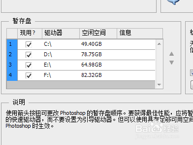 最后,暂存盘设置中,勾选所有内存盘,这样设置就完当作了,PS运行速度就大大提高了!