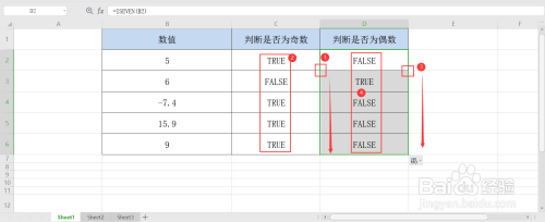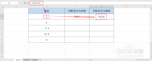 继续在D2单位格中输入公式=ISEVEN(B2),判定B2单位格中数值是否为偶数,按回车键获取成果;