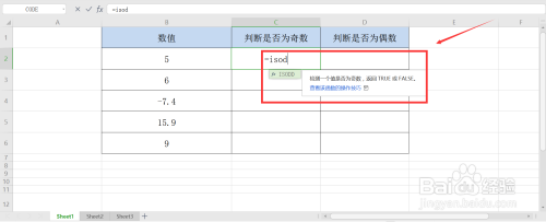 完当作表格清算后,我们在单位格中输入=ISODD,可以知道其用途为判定数值是否为奇数;