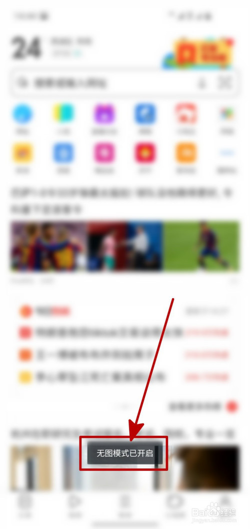 无图模式开启后,回到UC浏览器首页,可以看到“无图模式已开启”的动静提醒。