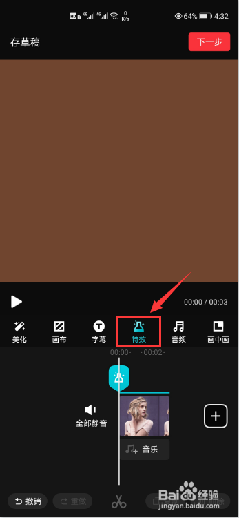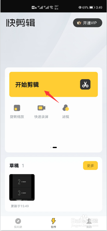 首先,在手机桌面上点击“快剪辑”应用图标,进入程序。点击图示处的“起头剪辑”功能按键。