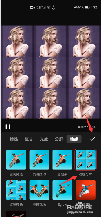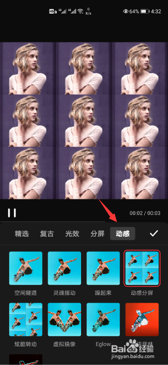 在“动感”栏中点选“动感分屏”结果,进行下载,应用后点击右侧“√”号进行应用。