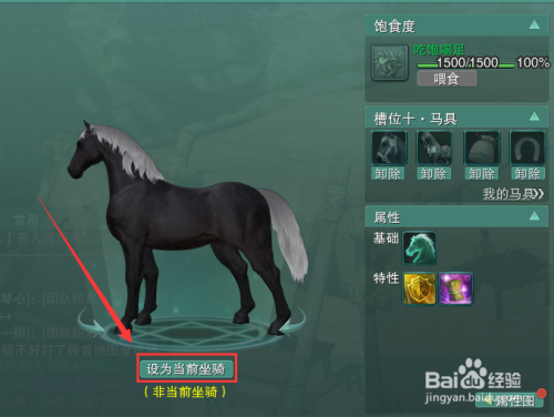 最后,我们选中忽雷驳后,点击右侧呈现的忽雷驳下面的【设为当前坐骑】按钮,我们就能利用【骑御】技术骑乘忽雷驳啦~
