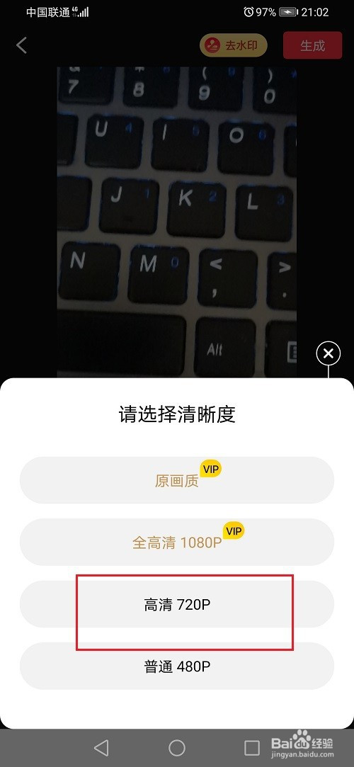 第四步点击生当作之后,选择视频清楚度