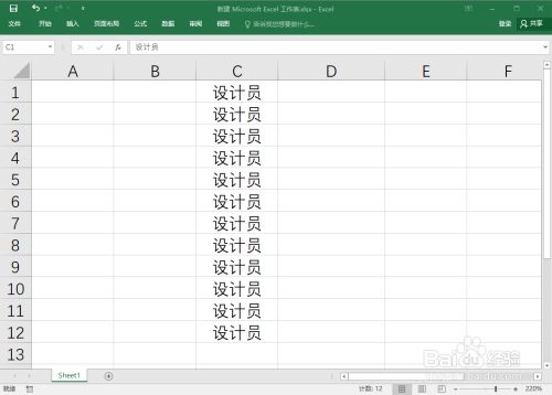 选中第一个单位格,例如“C1”,输入数据“设计员”。