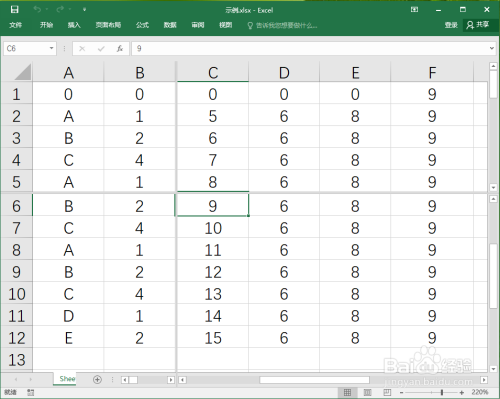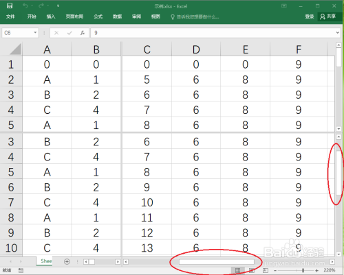 可以看到系统主动以“ C6” 单位格为中间,将工作表拆分为 4 个窗口,如下图所示,拖动程度滚动条或垂直滚动条即可对比查看工作表中的数据。