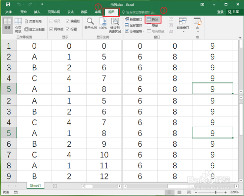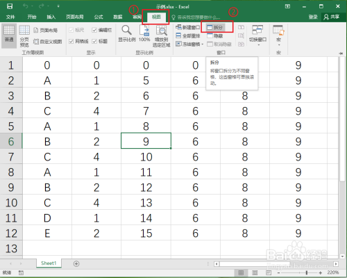 依次点击【视图】选项卡>>【拆分】按钮,就可以打消拆分窗口。
