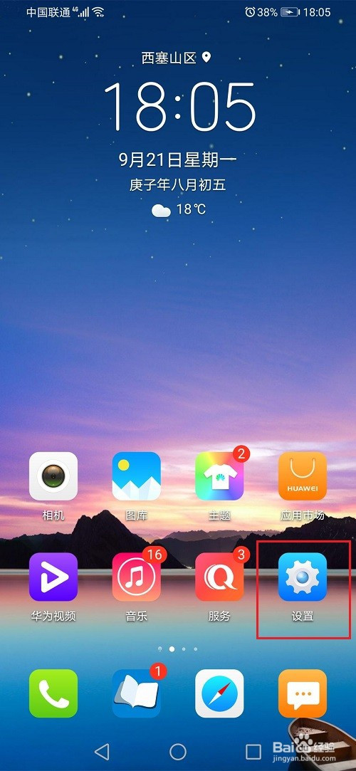 第一步进去华为手机桌面,点击手机设置