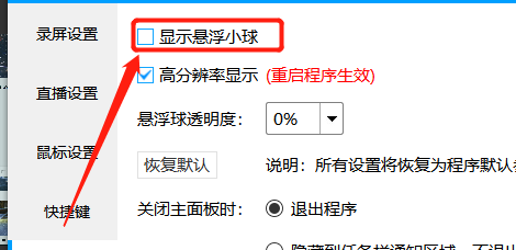 4、【打消】勾选【显示悬浮小球】选项