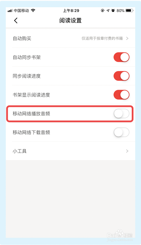 5.在【阅读设置】界面,点击【移动收集播放音频】选项,完当作以上步调京东念书app即可封闭移动收集播放音频功能。