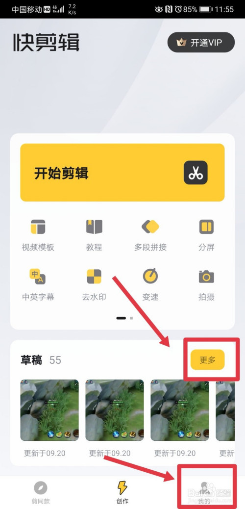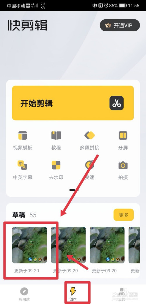 打开快剪辑app后,我们在创作页面底部可以看到有良多草稿文件,我们点击进入单条草稿视频;