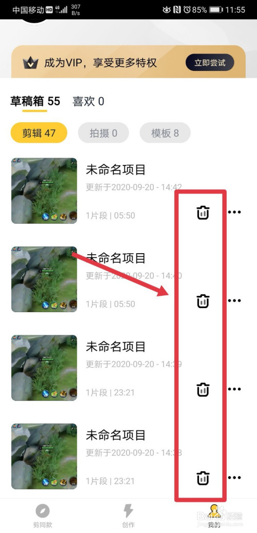 在小我中间页面,会默认显示草稿箱剪辑页面,草稿箱剪辑页面中存放的都是我们剪辑视频操作时生当作的草稿视频,我们点击视频后面的删除按钮,进行删除操作;