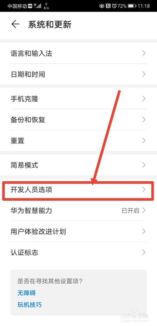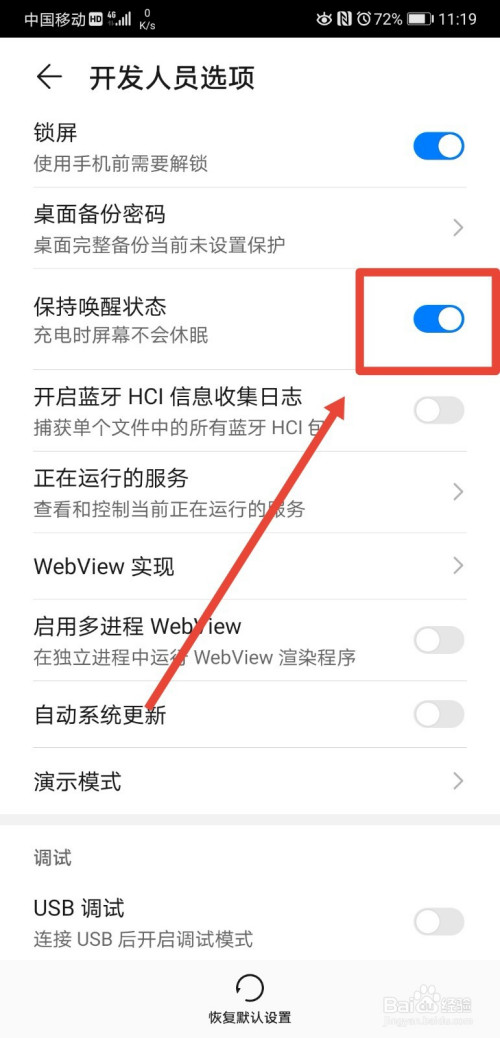 第六步,进入开辟人员选项页面后,将该页面的连结叫醒状况功能打开,手机将不会进入休眠状况。