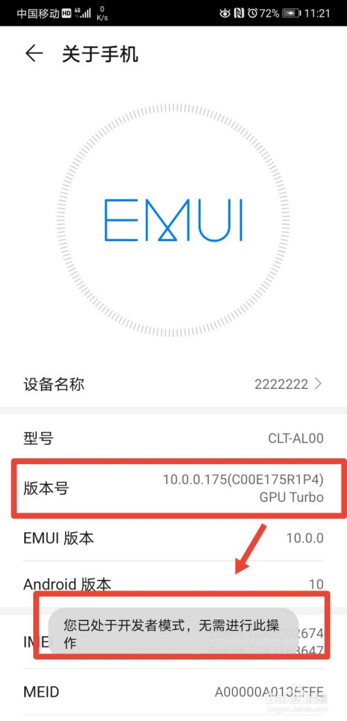 第三步,在关于手机页面持续点击7次版本号,开启手机开辟者模式;
