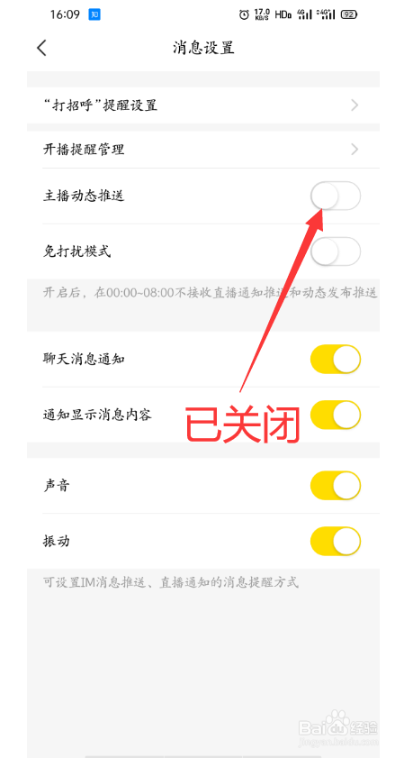 第四步:点击【本家儿播动态推送】选项右侧的黄白色【开关头】,将其封闭