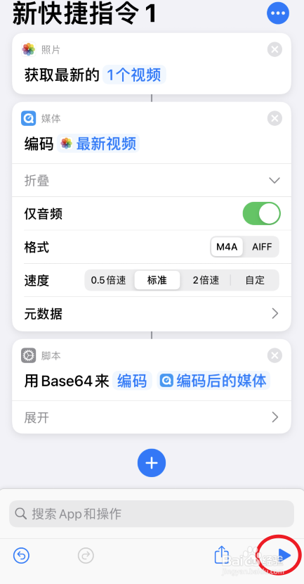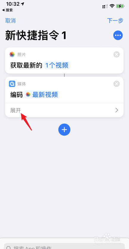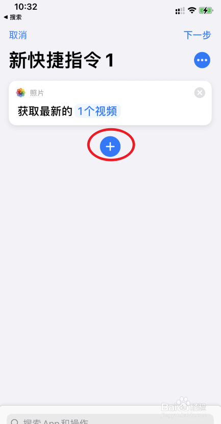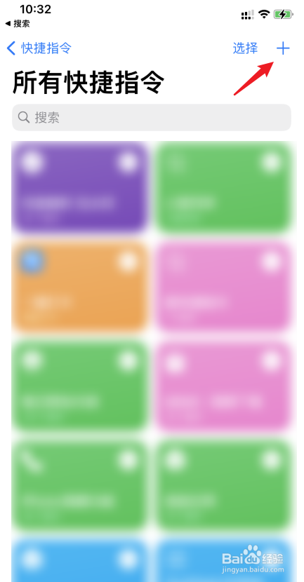 将需要设置提醒音的视频下载到手机内。打开快捷指令应用,选择右上方的加号。