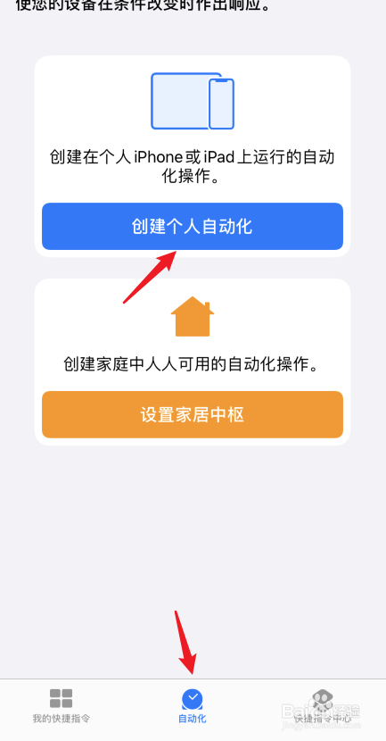 退出后,在快捷指令内,点击主动化,选择建立小我主动化。