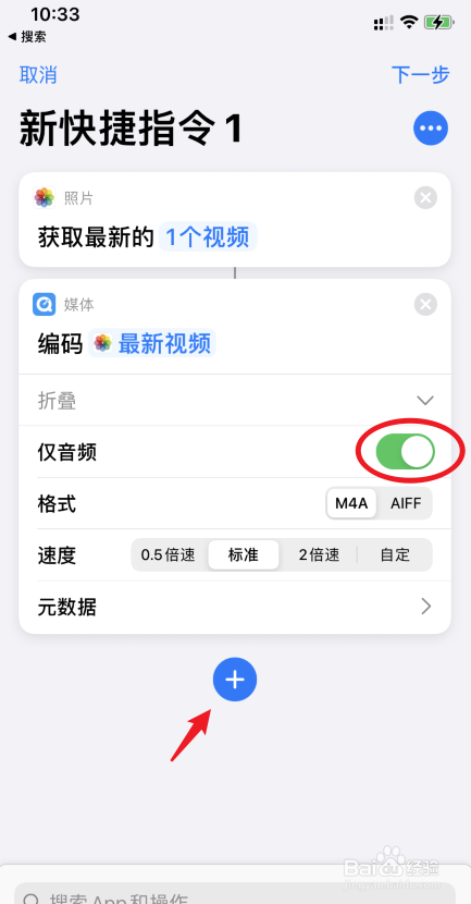 打开折叠的菜单后,将仅音频的开关打开。之后,点击下方的加号。
